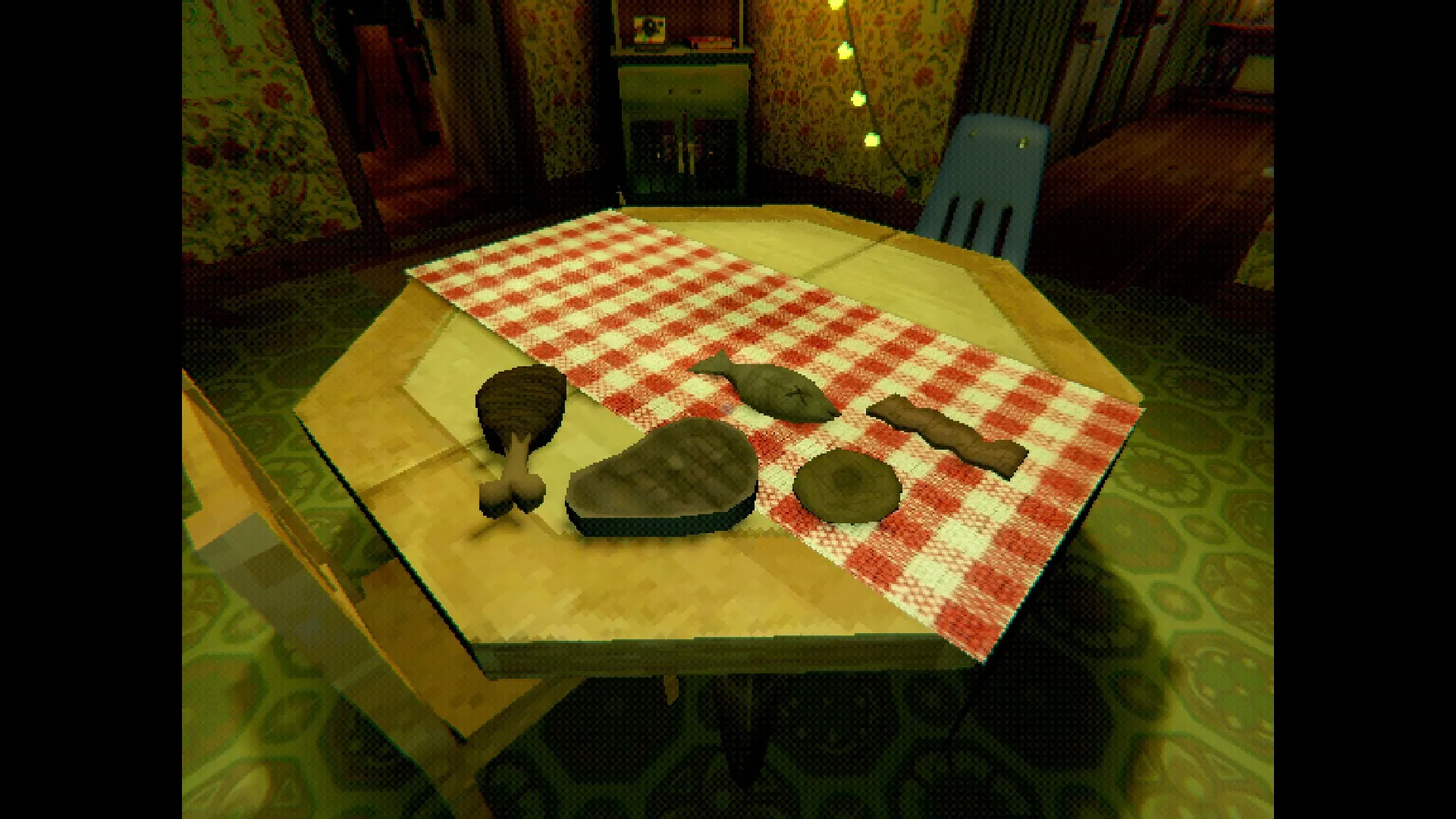 Burnt chicken, steak, fish, egg and bacon