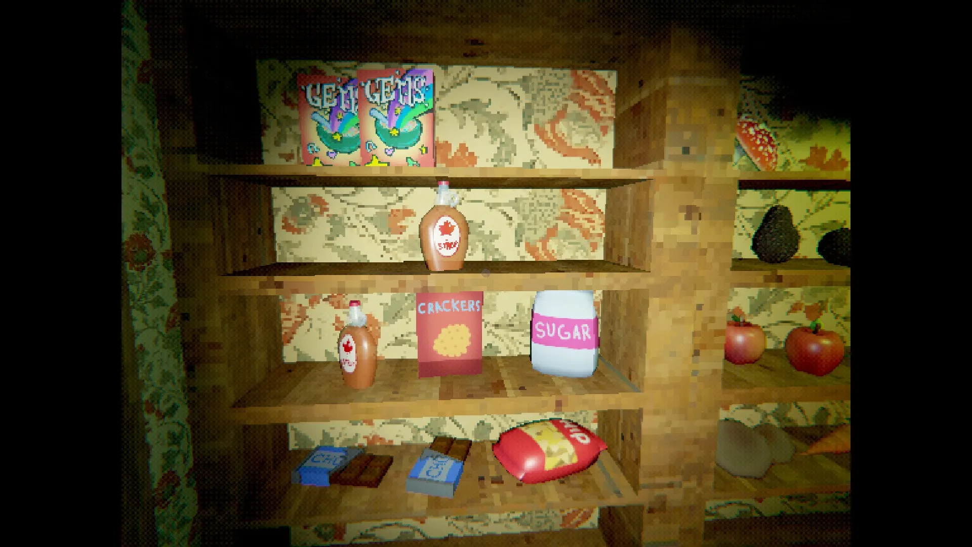 Cereal, maple syrup, crackers, sugar, chocolate bars, chips